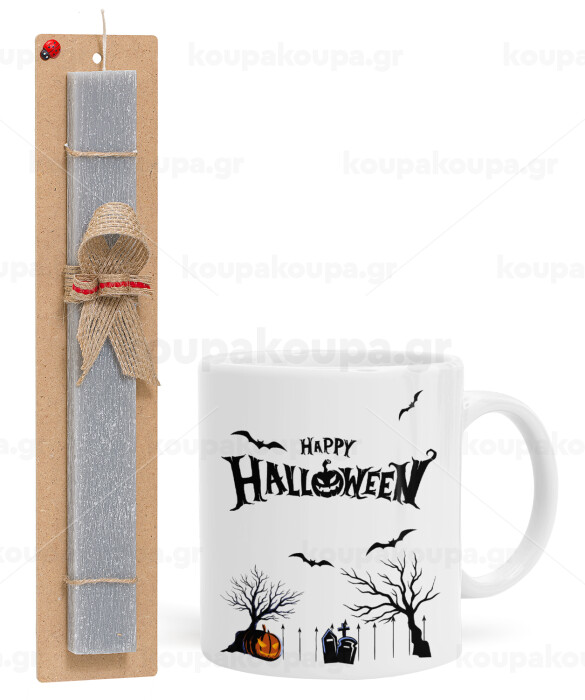 Happy Halloween cemetery, Πασχαλινή Λαμπάδα με Κούπα κεραμική (330ml) & κερί αρωματικό πλακέ (30cm) (ΓΚΡΙ)