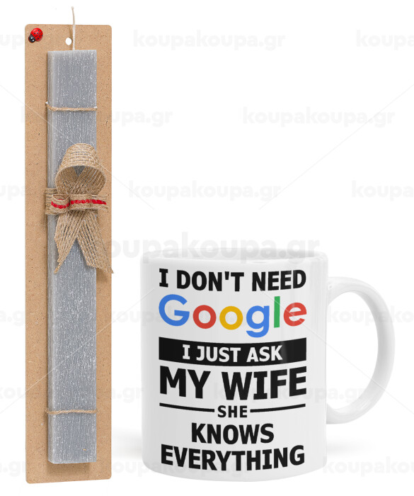 I don't need Google, just ask my WIFE, Πασχαλινή Λαμπάδα με Κούπα κεραμική (330ml) & κερί αρωματικό πλακέ (30cm) (ΓΚΡΙ)