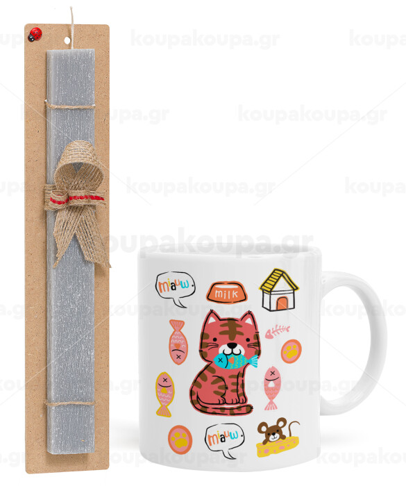 Cats and Fishes, Πασχαλινή Λαμπάδα με Κούπα κεραμική (330ml) & κερί αρωματικό πλακέ (30cm) (ΓΚΡΙ)