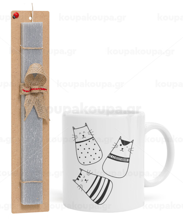 Cute cats, Πασχαλινή Λαμπάδα με Κούπα κεραμική (330ml) & κερί αρωματικό πλακέ (30cm) (ΓΚΡΙ)