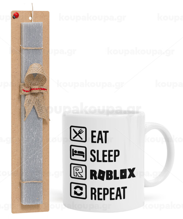 Eat, Sleep, Roblox, Repeat, Πασχαλινή Λαμπάδα με Κούπα κεραμική (330ml) & κερί αρωματικό πλακέ (30cm) (ΓΚΡΙ)