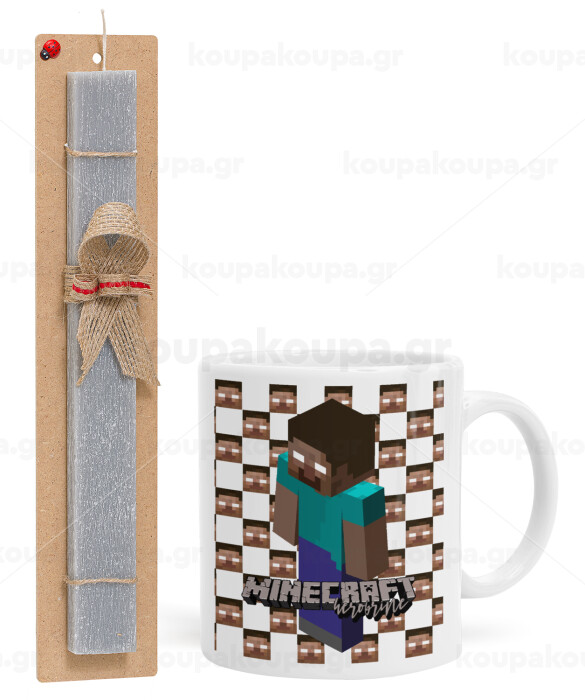 Minecraft herobrine, Πασχαλινή Λαμπάδα με Κούπα κεραμική (330ml) & κερί αρωματικό πλακέ (30cm) (ΓΚΡΙ)