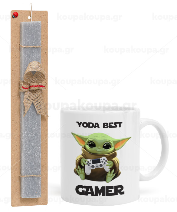 Yoda Best Gamer, Πασχαλινή Λαμπάδα με Κούπα κεραμική (330ml) & κερί αρωματικό πλακέ (30cm) (ΓΚΡΙ)