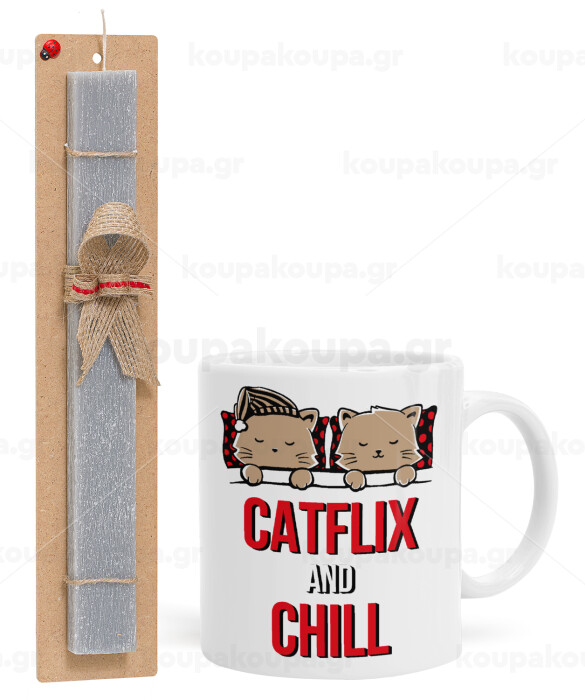 Catflix and Chill, Πασχαλινή Λαμπάδα με Κούπα κεραμική (330ml) & κερί αρωματικό πλακέ (30cm) (ΓΚΡΙ)