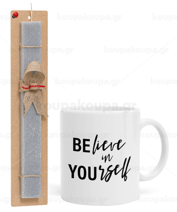 Believe in your self, Πασχαλινή Λαμπάδα με Κούπα κεραμική (330ml) & κερί αρωματικό πλακέ (30cm) (ΓΚΡΙ)