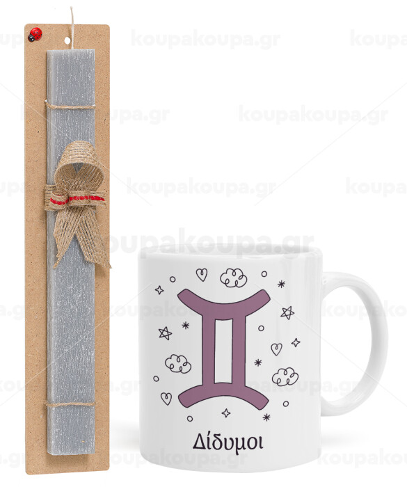 Ζώδια Δίδυμοι, Πασχαλινή Λαμπάδα με Κούπα κεραμική (330ml) & κερί αρωματικό πλακέ (30cm) (ΓΚΡΙ)
