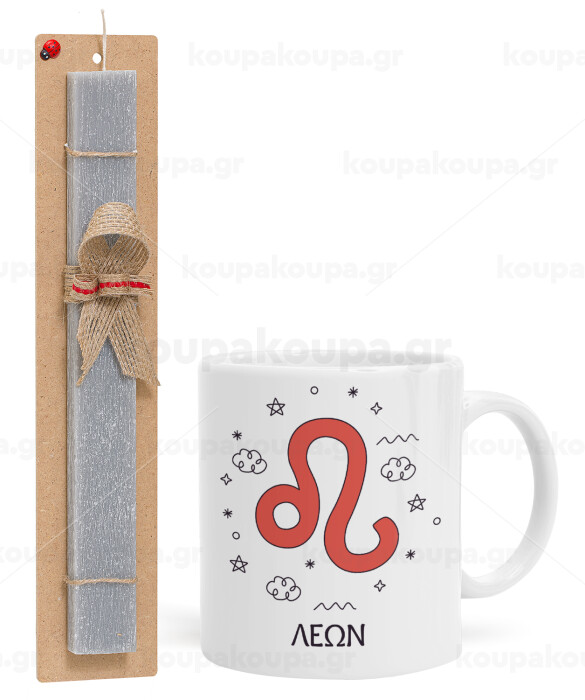 Ζώδια Λέων, Πασχαλινή Λαμπάδα με Κούπα κεραμική (330ml) & κερί αρωματικό πλακέ (30cm) (ΓΚΡΙ)