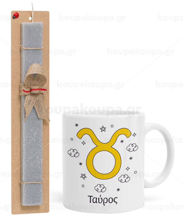 Ζώδια Ταύρος, Πασχαλινή Λαμπάδα με Κούπα κεραμική (330ml) & κερί αρωματικό πλακέ (30cm) (ΓΚΡΙ)