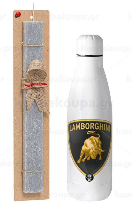 Lamborghini, Πασχαλινή Λαμπάδα με μεταλλικό παγούρι θερμός ανοξείδωτο (500ml) & κερί αρωματικό πλακέ (30cm) (ΓΚΡΙ)