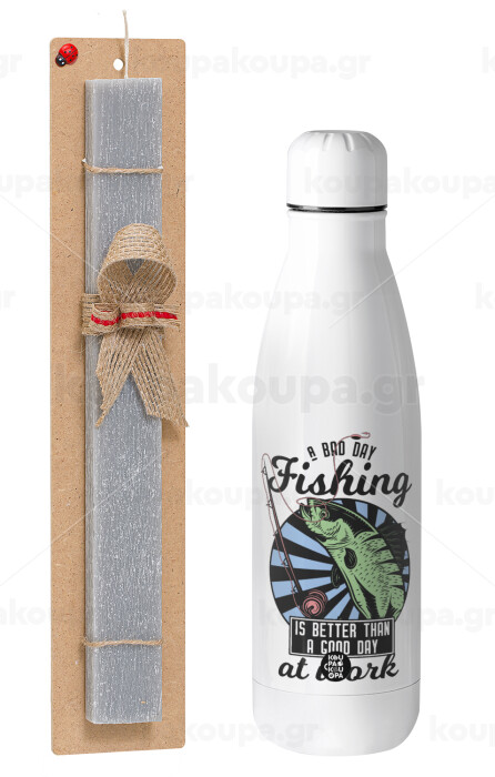 A bad day FISHING is better than a good day at work, Πασχαλινή Λαμπάδα με μεταλλικό παγούρι θερμός ανοξείδωτο (500ml) & κερί αρωματικό πλακέ (30cm) (ΓΚΡΙ)