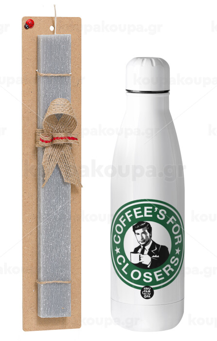 Coffee's for closers, Πασχαλινή Λαμπάδα με μεταλλικό παγούρι θερμός ανοξείδωτο (500ml) & κερί αρωματικό πλακέ (30cm) (ΓΚΡΙ)