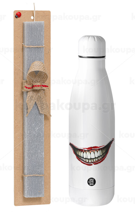 Joker smile, Πασχαλινή Λαμπάδα με μεταλλικό παγούρι θερμός ανοξείδωτο (500ml) & κερί αρωματικό πλακέ (30cm) (ΓΚΡΙ)