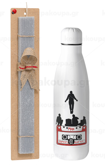 Running up that hill, Stranger Things, Πασχαλινή Λαμπάδα με μεταλλικό παγούρι θερμός ανοξείδωτο (500ml) & κερί αρωματικό πλακέ (30cm) (ΓΚΡΙ)