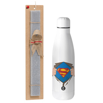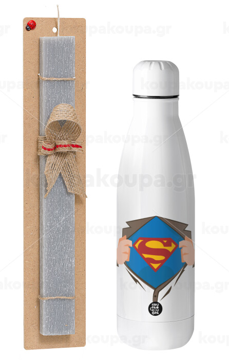 Superman hands, Πασχαλινή Λαμπάδα με μεταλλικό παγούρι θερμός ανοξείδωτο (500ml) & κερί αρωματικό πλακέ (30cm) (ΓΚΡΙ)