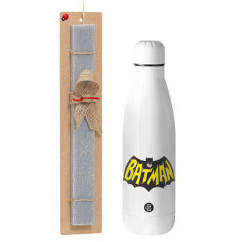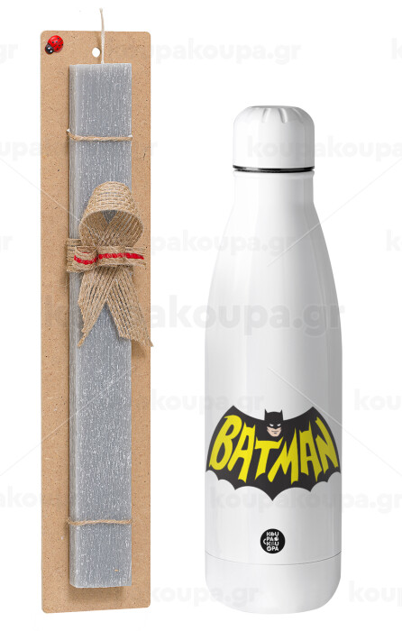 Batman classic logo, Πασχαλινή Λαμπάδα με μεταλλικό παγούρι θερμός ανοξείδωτο (500ml) & κερί αρωματικό πλακέ (30cm) (ΓΚΡΙ)