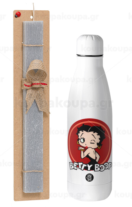 Betty Boop kiss, Πασχαλινή Λαμπάδα με μεταλλικό παγούρι θερμός ανοξείδωτο (500ml) & κερί αρωματικό πλακέ (30cm) (ΓΚΡΙ)