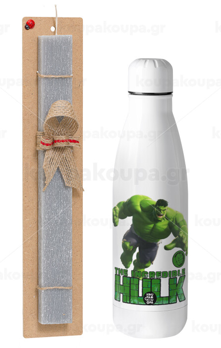 Hulk, Πασχαλινή Λαμπάδα με μεταλλικό παγούρι θερμός ανοξείδωτο (500ml) & κερί αρωματικό πλακέ (30cm) (ΓΚΡΙ)
