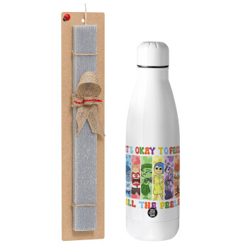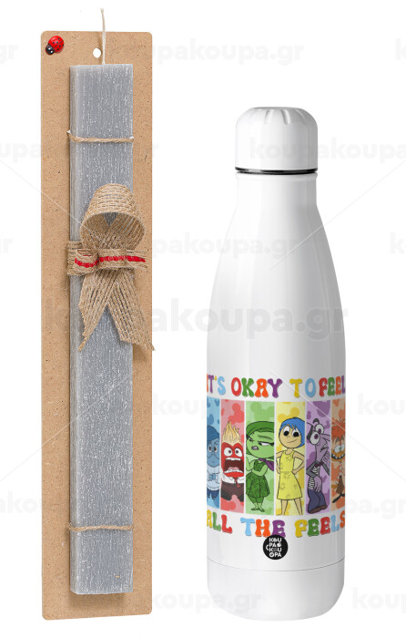 Inside Out It's Okay To Feel All The Feels , Πασχαλινή Λαμπάδα με μεταλλικό παγούρι θερμός ανοξείδωτο (500ml) & κερί αρωματικό πλακέ (30cm) (ΓΚΡΙ)