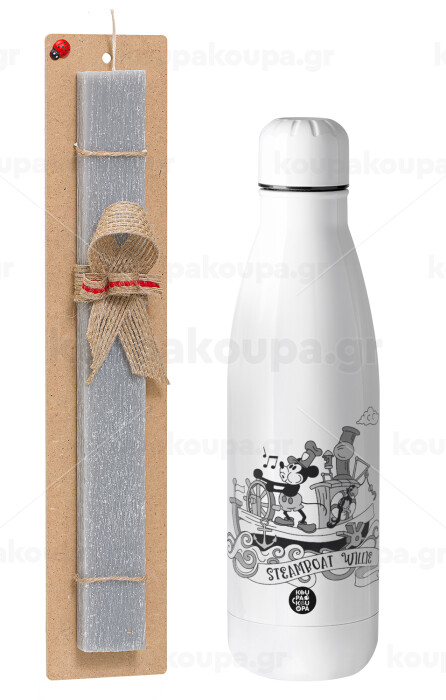 Mickey steamboat, Πασχαλινή Λαμπάδα με μεταλλικό παγούρι θερμός ανοξείδωτο (500ml) & κερί αρωματικό πλακέ (30cm) (ΓΚΡΙ)