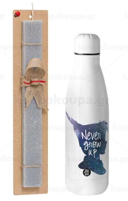 Never Grow UP, Πασχαλινή Λαμπάδα με μεταλλικό παγούρι θερμός ανοξείδωτο (500ml) & κερί αρωματικό πλακέ (30cm) (ΓΚΡΙ)