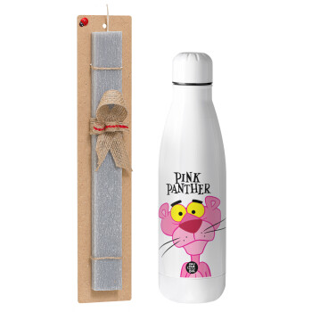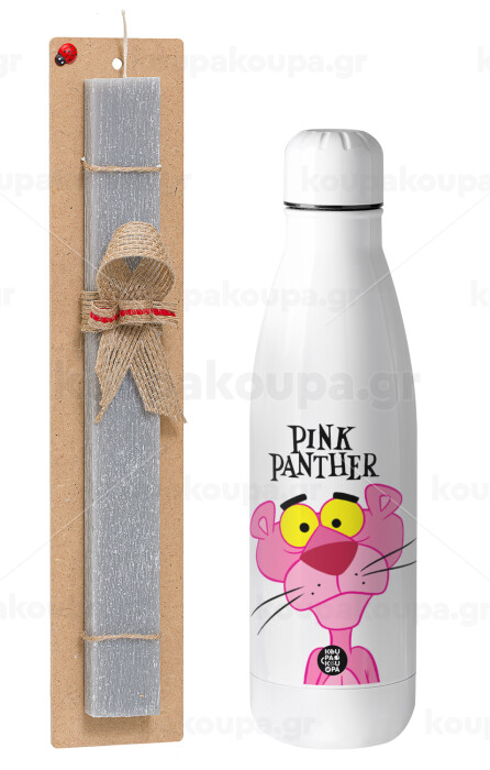 Pink Panther cartoon, Πασχαλινή Λαμπάδα με μεταλλικό παγούρι θερμός ανοξείδωτο (500ml) & κερί αρωματικό πλακέ (30cm) (ΓΚΡΙ)