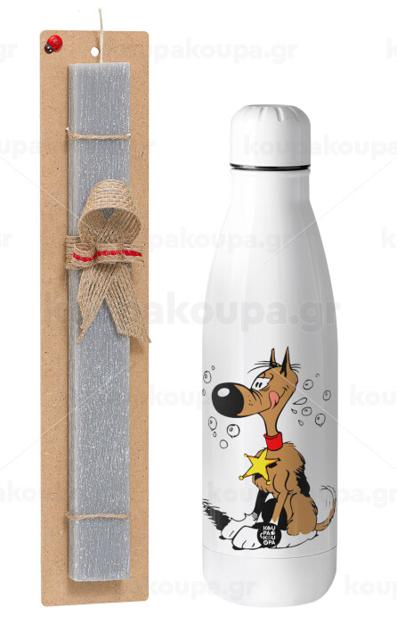 Rantanplan (Ρανταπλάν), Πασχαλινή Λαμπάδα με μεταλλικό παγούρι θερμός ανοξείδωτο (500ml) & κερί αρωματικό πλακέ (30cm) (ΓΚΡΙ)