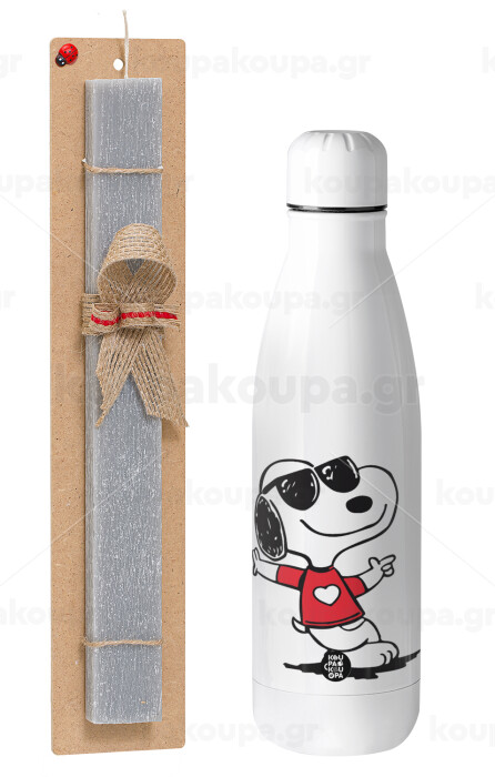 Snoopy καρδούλα, Πασχαλινή Λαμπάδα με μεταλλικό παγούρι θερμός ανοξείδωτο (500ml) & κερί αρωματικό πλακέ (30cm) (ΓΚΡΙ)