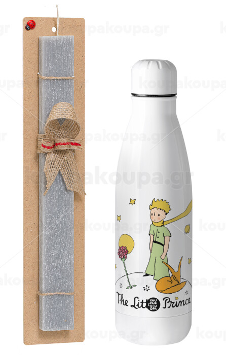 Ο μικρός πρίγκιπας classic, Πασχαλινή Λαμπάδα με μεταλλικό παγούρι θερμός ανοξείδωτο (500ml) & κερί αρωματικό πλακέ (30cm) (ΓΚΡΙ)