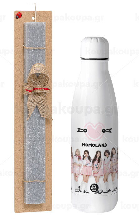 Momoland pink, Πασχαλινή Λαμπάδα με μεταλλικό παγούρι θερμός ανοξείδωτο (500ml) & κερί αρωματικό πλακέ (30cm) (ΓΚΡΙ)