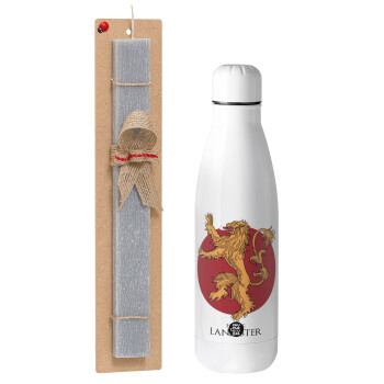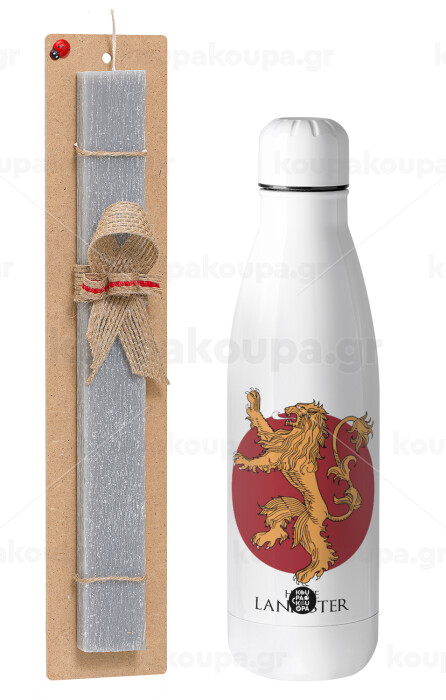 House Lannister GOT, Πασχαλινή Λαμπάδα με μεταλλικό παγούρι θερμός ανοξείδωτο (500ml) & κερί αρωματικό πλακέ (30cm) (ΓΚΡΙ)