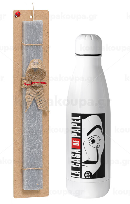 La casa de papel vertical, Πασχαλινή Λαμπάδα με μεταλλικό παγούρι θερμός ανοξείδωτο (500ml) & κερί αρωματικό πλακέ (30cm) (ΓΚΡΙ)