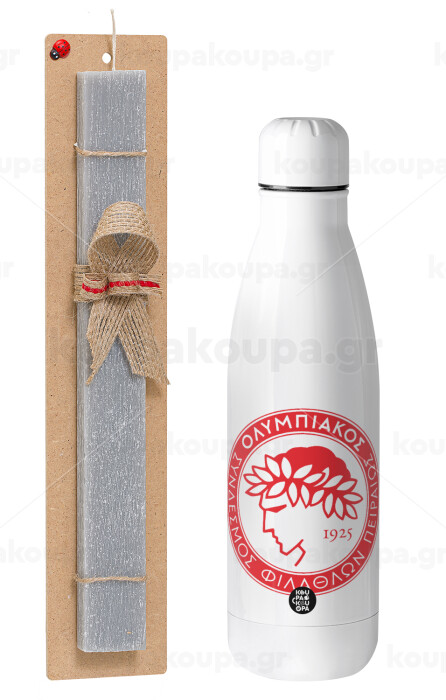 Ολυμπιακός, Πασχαλινή Λαμπάδα με μεταλλικό παγούρι θερμός ανοξείδωτο (500ml) & κερί αρωματικό πλακέ (30cm) (ΓΚΡΙ)