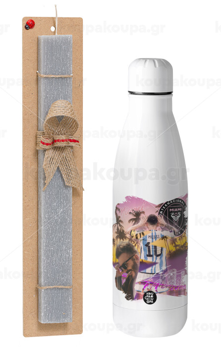 Lionel Messi Miami, Πασχαλινή Λαμπάδα με μεταλλικό παγούρι θερμός ανοξείδωτο (500ml) & κερί αρωματικό πλακέ (30cm) (ΓΚΡΙ)