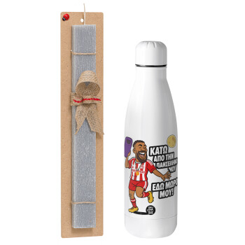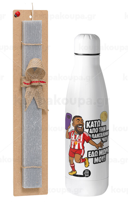 Ροντινέι, "ΚΑΤΩ ΑΠΟ ΤΗΝ ΠΑΝΣΕΛΗΝΟ ΜΟΥ!", Πασχαλινή Λαμπάδα με μεταλλικό παγούρι θερμός ανοξείδωτο (500ml) & κερί αρωματικό πλακέ (30cm) (ΓΚΡΙ)