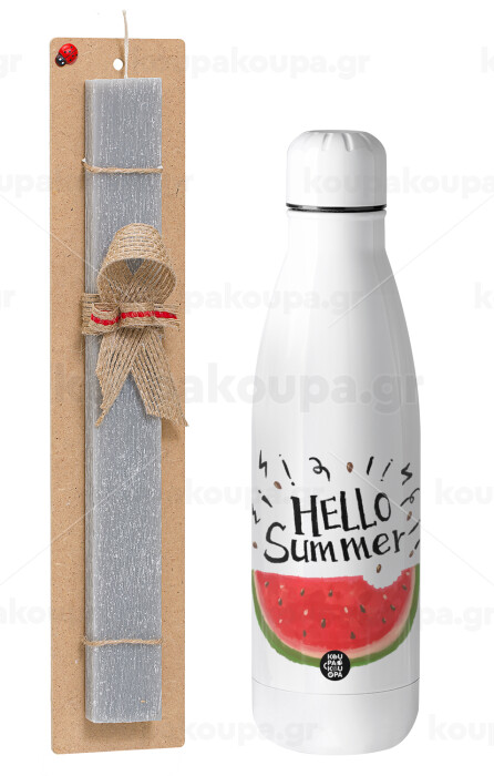 Summer Watermelon, Πασχαλινή Λαμπάδα με μεταλλικό παγούρι θερμός ανοξείδωτο (500ml) & κερί αρωματικό πλακέ (30cm) (ΓΚΡΙ)