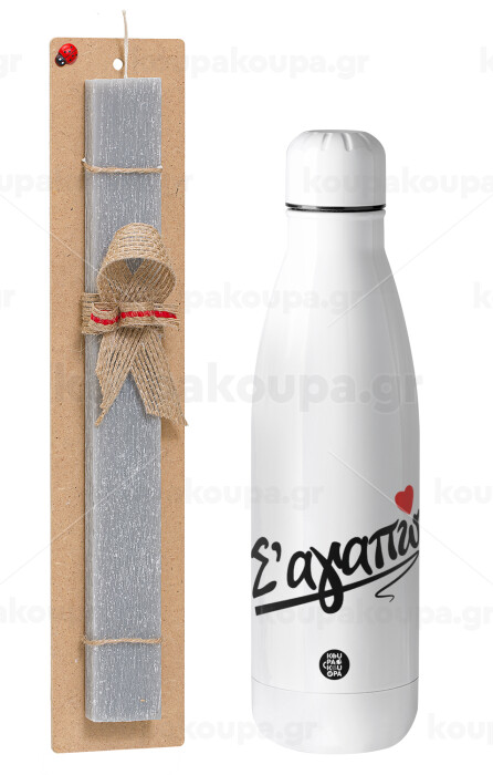 Σ΄ αγαπώ!!!, Πασχαλινή Λαμπάδα με μεταλλικό παγούρι θερμός ανοξείδωτο (500ml) & κερί αρωματικό πλακέ (30cm) (ΓΚΡΙ)