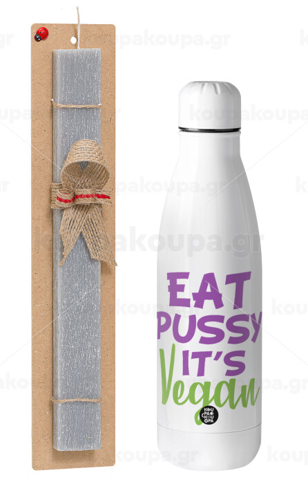 EAT pussy it's vegan, Πασχαλινή Λαμπάδα με μεταλλικό παγούρι θερμός ανοξείδωτο (500ml) & κερί αρωματικό πλακέ (30cm) (ΓΚΡΙ)