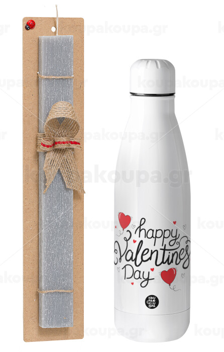 Happy Valentines Day!!!, Πασχαλινή Λαμπάδα με μεταλλικό παγούρι θερμός ανοξείδωτο (500ml) & κερί αρωματικό πλακέ (30cm) (ΓΚΡΙ)