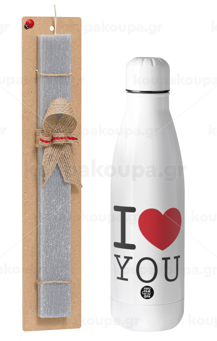 I Love you classic, Πασχαλινή Λαμπάδα με μεταλλικό παγούρι θερμός ανοξείδωτο (500ml) & κερί αρωματικό πλακέ (30cm) (ΓΚΡΙ)