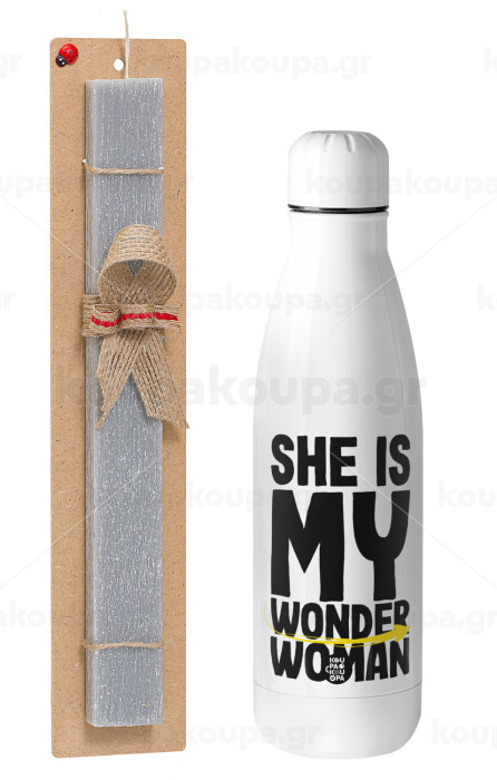She is my wonder woman, Πασχαλινή Λαμπάδα με μεταλλικό παγούρι θερμός ανοξείδωτο (500ml) & κερί αρωματικό πλακέ (30cm) (ΓΚΡΙ)