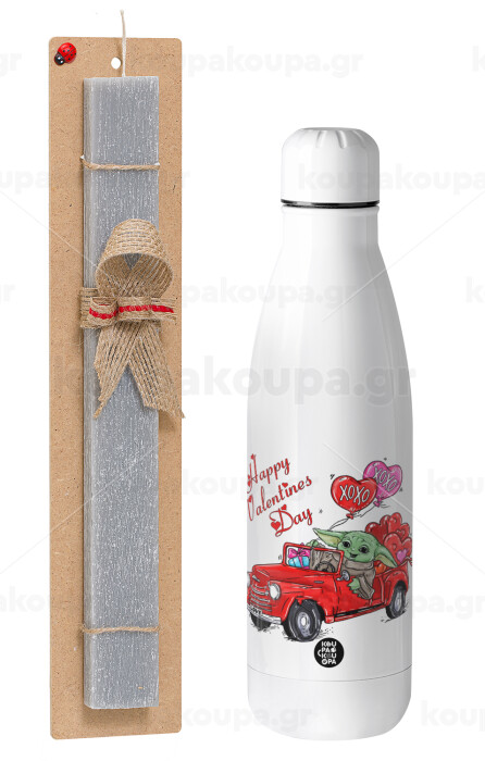 Yoda, happy valentines day (xoxo), Πασχαλινή Λαμπάδα με μεταλλικό παγούρι θερμός ανοξείδωτο (500ml) & κερί αρωματικό πλακέ (30cm) (ΓΚΡΙ)