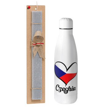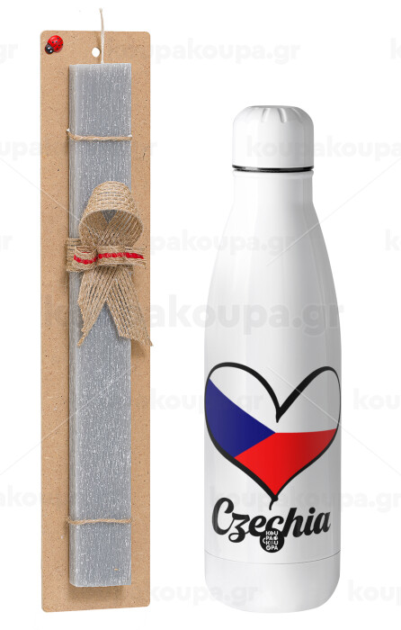 Czechia flag, Πασχαλινή Λαμπάδα με μεταλλικό παγούρι θερμός ανοξείδωτο (500ml) & κερί αρωματικό πλακέ (30cm) (ΓΚΡΙ)