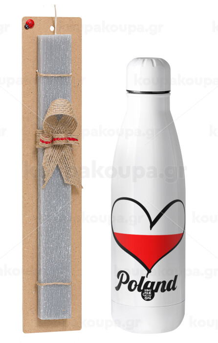 Poland flag, Πασχαλινή Λαμπάδα με μεταλλικό παγούρι θερμός ανοξείδωτο (500ml) & κερί αρωματικό πλακέ (30cm) (ΓΚΡΙ)