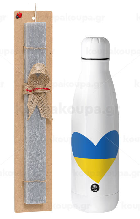 UKRAINE heart, Πασχαλινή Λαμπάδα με μεταλλικό παγούρι θερμός ανοξείδωτο (500ml) & κερί αρωματικό πλακέ (30cm) (ΓΚΡΙ)