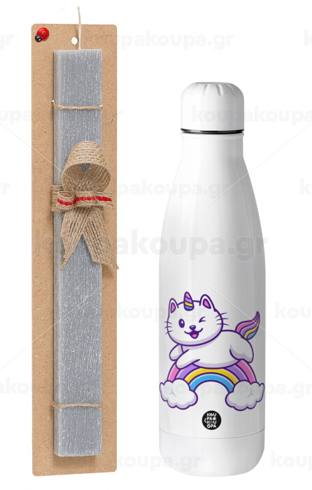Cute cat unicorn, Πασχαλινή Λαμπάδα με μεταλλικό παγούρι θερμός ανοξείδωτο (500ml) & κερί αρωματικό πλακέ (30cm) (ΓΚΡΙ)