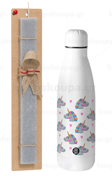 Unicorn, Πασχαλινή Λαμπάδα με μεταλλικό παγούρι θερμός ανοξείδωτο (500ml) & κερί αρωματικό πλακέ (30cm) (ΓΚΡΙ)
