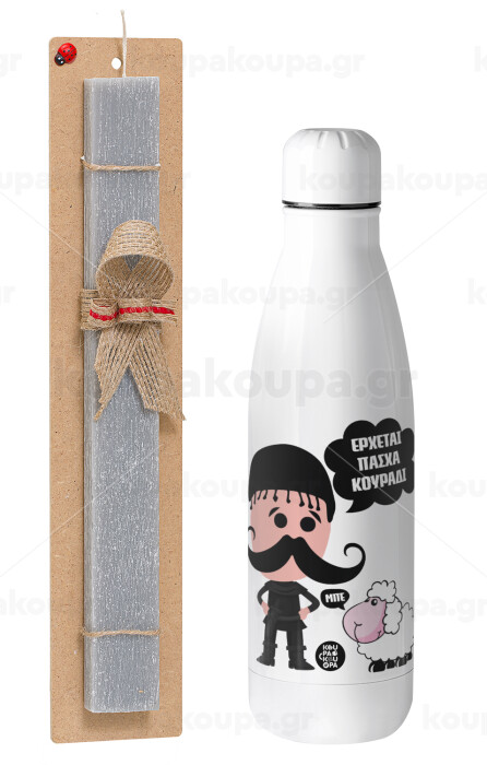 Κρητικός "Έρχεται Πάσχα κουράδι", Πασχαλινή Λαμπάδα με μεταλλικό παγούρι θερμός ανοξείδωτο (500ml) & κερί αρωματικό πλακέ (30cm) (ΓΚΡΙ)