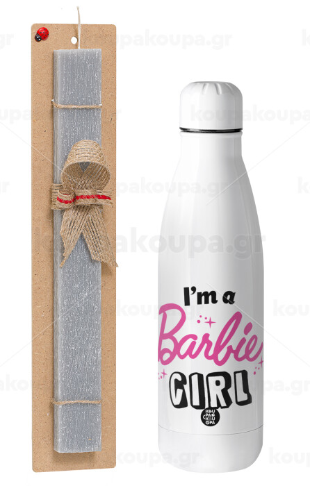 I'm Barbie girl, Πασχαλινή Λαμπάδα με μεταλλικό παγούρι θερμός ανοξείδωτο (500ml) & κερί αρωματικό πλακέ (30cm) (ΓΚΡΙ)
