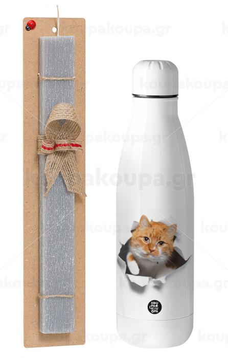 Cat cracked, Πασχαλινή Λαμπάδα με μεταλλικό παγούρι θερμός ανοξείδωτο (500ml) & κερί αρωματικό πλακέ (30cm) (ΓΚΡΙ)