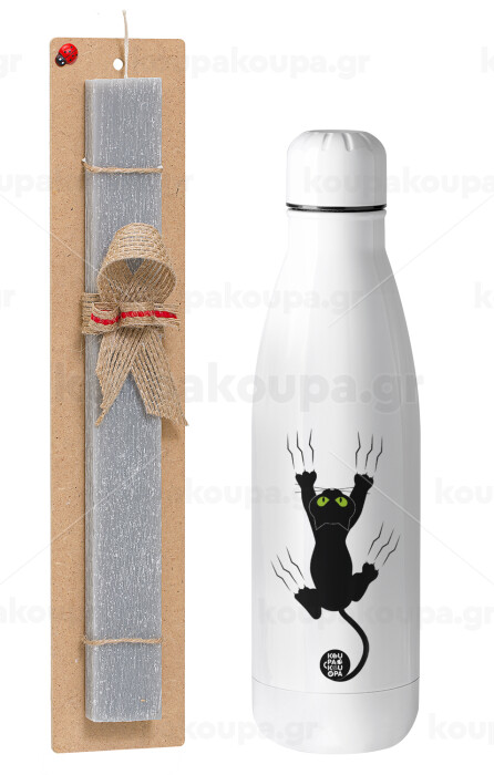 Γατούλα γρατζουνιά, Πασχαλινή Λαμπάδα με μεταλλικό παγούρι θερμός ανοξείδωτο (500ml) & κερί αρωματικό πλακέ (30cm) (ΓΚΡΙ)